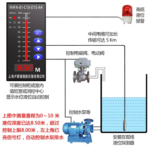 液位探測(cè)器+中間電纜+液位控制顯示器構(gòu)成,能實(shí)現(xiàn)遠(yuǎn)距